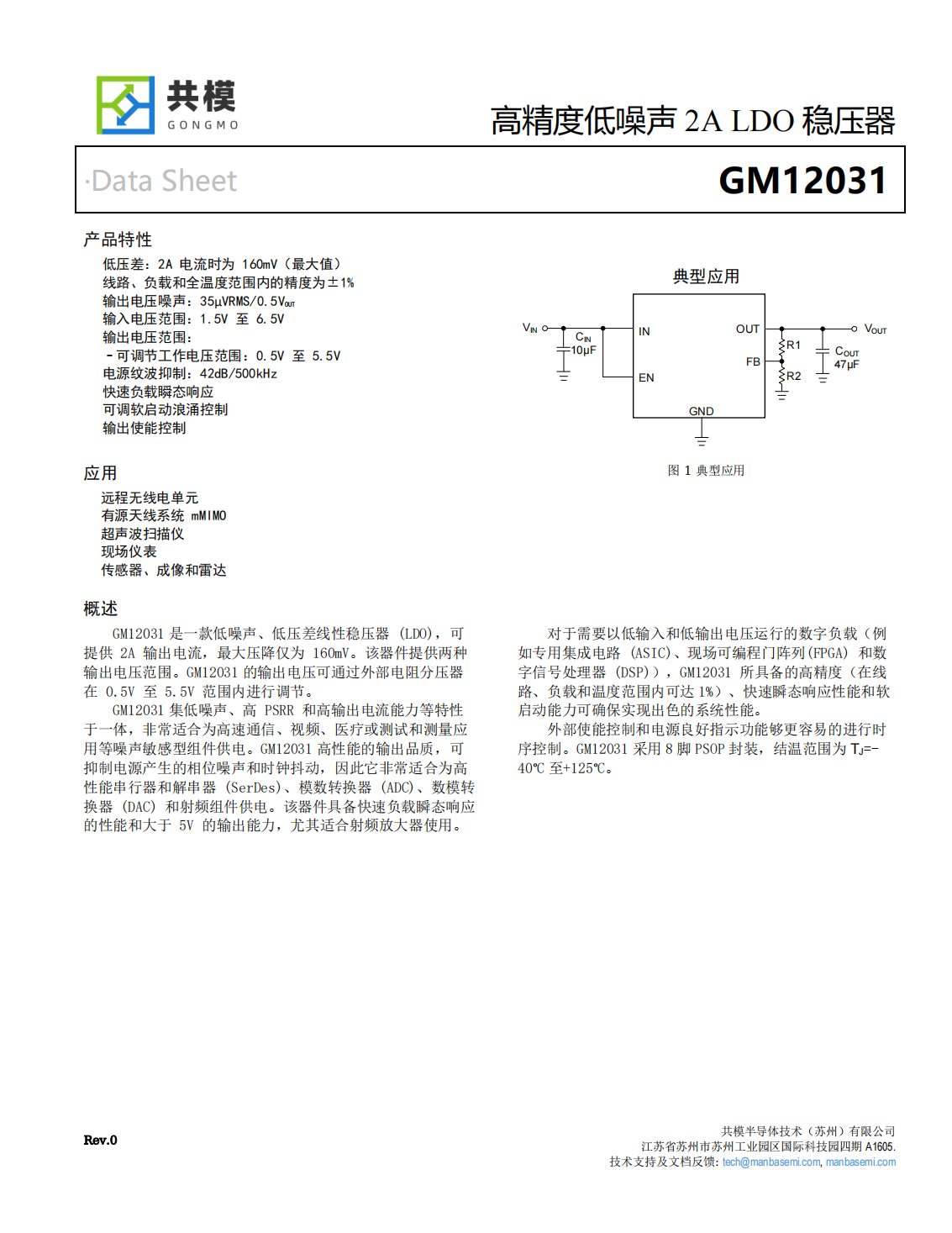 GM12031是一款低噪聲、低壓差線性穩(wěn)壓器(LDO),可提供2A輸出電流,最大壓降僅為160mV。該器件提供兩種輸出電壓范圍。GM12031的輸出電壓可通過外部電阻分壓器在0.5V至5.5V范圍內(nèi)進行調(diào)節(jié)。