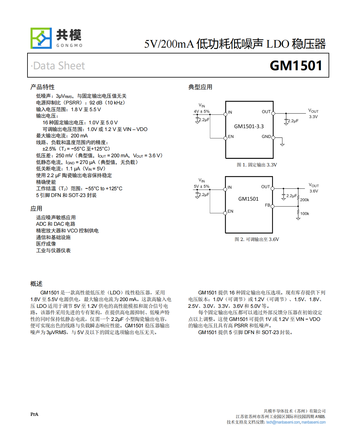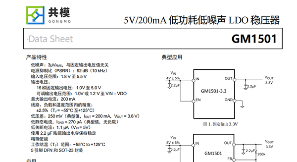 GM1501提供6種固定輸出電壓選項?,F(xiàn)有庫存提供下列電壓版本:1.0V(可調(diào)節(jié))或1.2V(可調(diào)節(jié))、1.5V、1.8V、2.5V、3.0V、3.3V、3.6V和 5.0V等。每個固定輸出電壓都可以通過外部反饋分壓器在初始設(shè)定點以上調(diào)整。這使 GM1501 可提供 1V 或 1.2V 至 VIN ? VDO的輸出電壓且具有高 PSRR 和低噪聲。GM1501提供5引腳DFN和SOT-23 封裝。